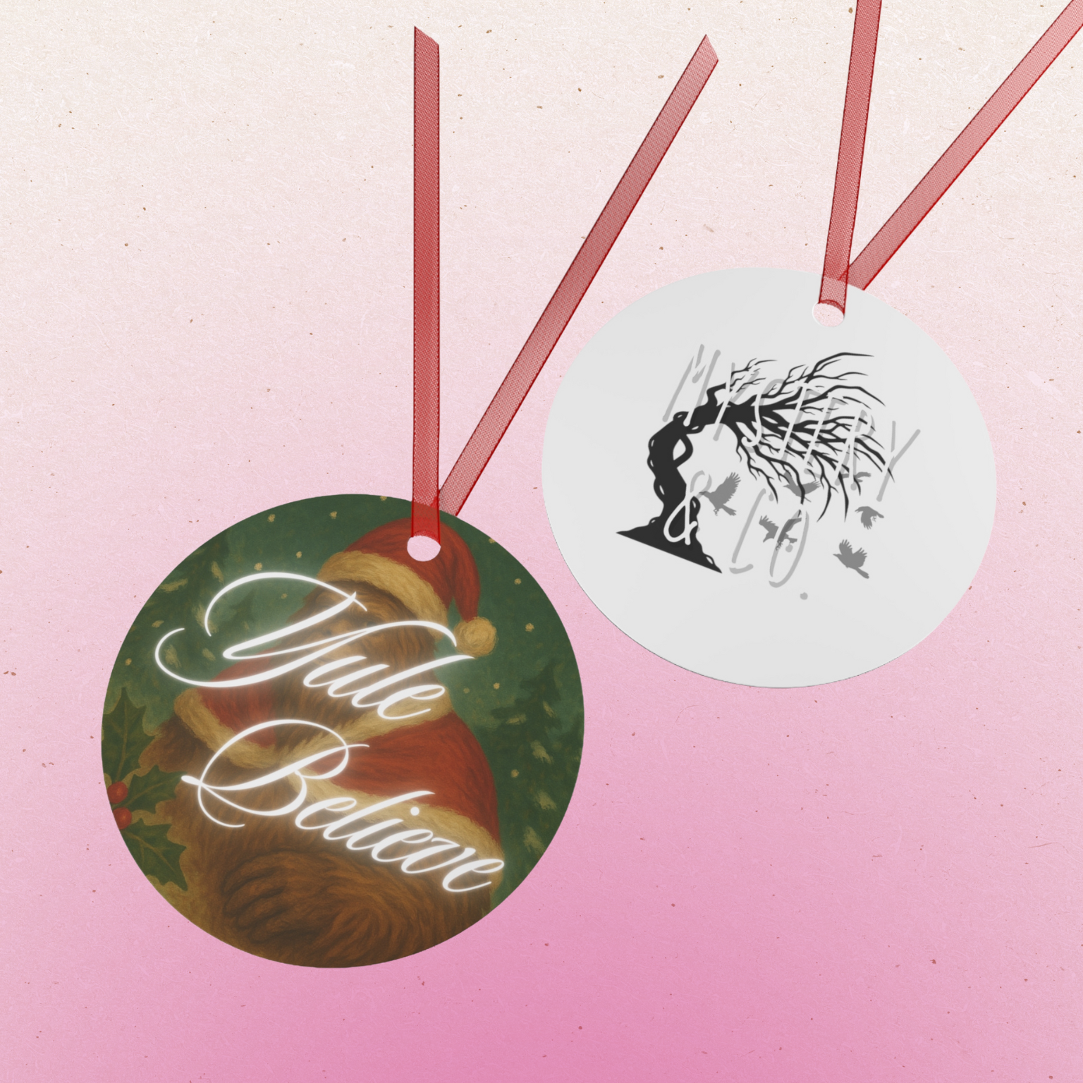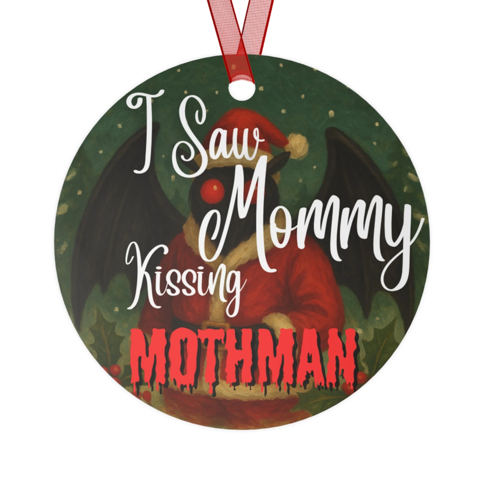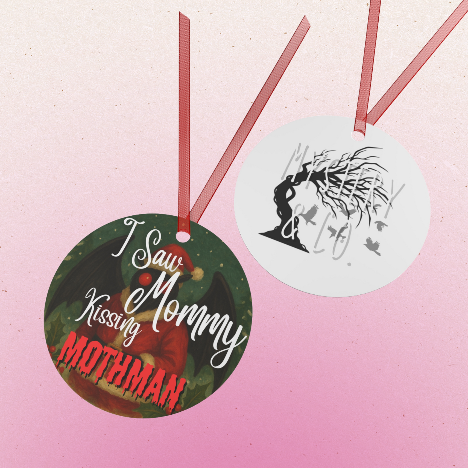 Add a little mischief to your holiday decor with our “I Saw Mommy Kissing Mothman” Ornament — a cheeky twist on a classic Christmas tune! Crafted from durable aluminum with a glossy finish, this playful ornament captures the perfect mix of festive charm and cryptid humor. Featuring Mothman caught under the mistletoe in rich, vibrant colors, it’s guaranteed to make guests laugh (and maybe glance up nervously at the sky).